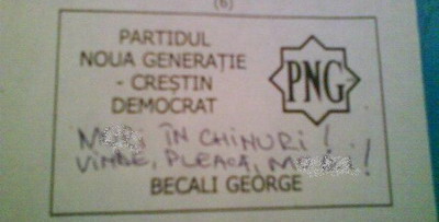 Alegerile prezindetiale reprezinta ocazia perfecta pentru suporterii Stelei de a-si manifesta nemultumirea fata de Gigi Becali! Astfel, buletinele de vot au continut deja traditionalele mesaje: "Becali, pleaca din Ghencea!" sau "Vinde! Pleaca! Mori!".